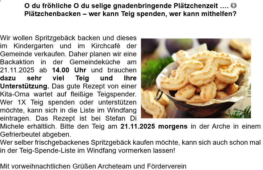Von Team Kinderarche14. November 2025 Jedes Jahr helfen uns Eltern sowie die Mitglieder des Fördervereins leckere Plätzchen zu backen.